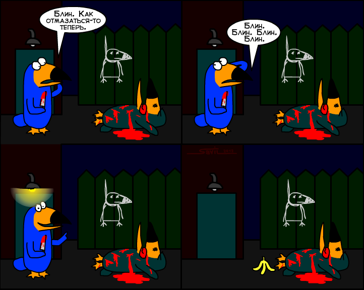 Прошу заменить картину. Мне просто внезапно пришло в голову, что стрип выглядит слишком ярко и не слишком нуарно, и я решил слегка понизить яркость и сделать изображение монохромным, что улучшило восприятие картинки.